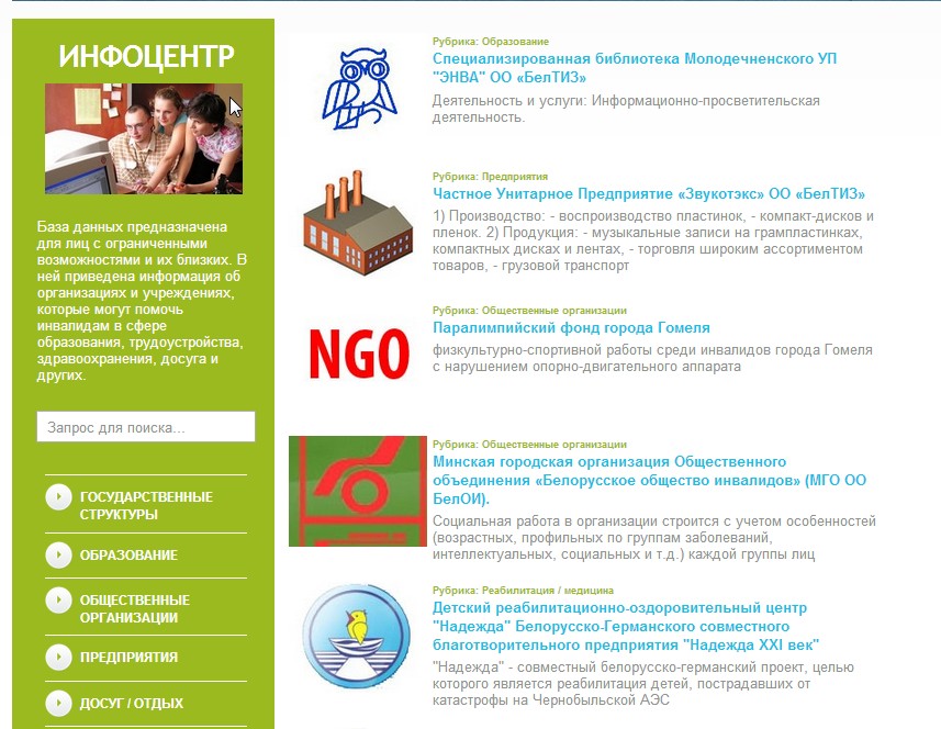 Проект осуществлён при поддержке немецкого партнёра - организации Fortotschka e.V. «Инфоцентр» стал первым белорусским интернет-ресурсом, на котором можно было ознакомиться с деятельностью всех государственных и общественных организаций, работающих с инвалидами в Беларуси, а также получить информацию об образовании, профориентации, трудоустройстве, лечении, реабилитации, организации досуга людей с ограниченными физическими и умственными возможностями, воспользоваться консультацией юриста и психолога, завести полезные знакомства и найти новых друзей.