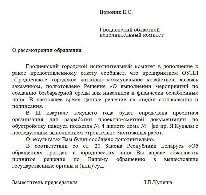 - Сперва подружка сама обивала порог своего ЖЭСа, пока ее пару раз вежливо не послали, не дали понять, что она ничего не получит и не стоит наглеть. Тогда Лена поделилась со мной, и мы решили обратиться в горисполком. Я составила и отправила (для верности сразу и в горисполком, и в облисполком) письмо с просьбой, описанием проблемы, ссылкой на законы (думаю, что это было важно – показать, что человек знает свои права) и фотографией подъезда.