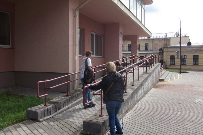Теперь, вооружившись рулеткой и фотоаппаратом, мы небольшой компанией вернулись сюда, чтобы убедиться в пригодности пандуса, удобство которого, конечно, уже оценили. Как показала практика, а доказали произведенные замеры (высота пандуса – 100 см, длина пандуса – 1000 см, т.е. 10 метров), стандарты 1:10 здесь соблюдены. Десять ступенек у входа тоже признаны вполне удобными, даже для тех, кому сложно передвигаться.