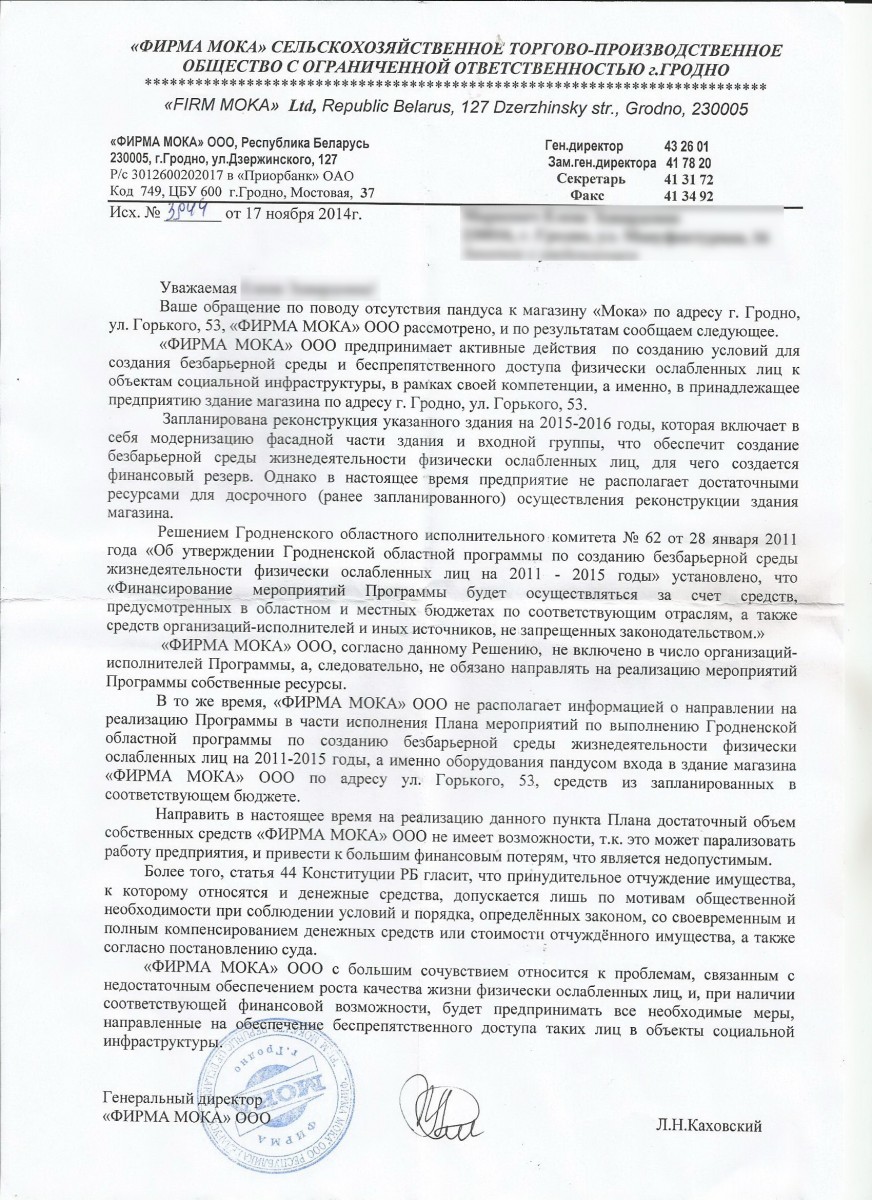 Кроме того, нам доходчиво объяснили, что решением горисполкома «фирма Мока» не включена в программу по созданию «безбарьерной среды» на 2011-2015 гг, а следовательно не обязана направлять на ее реализацию собственные ресурсы.
