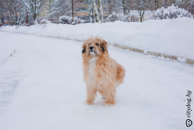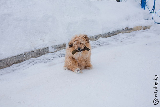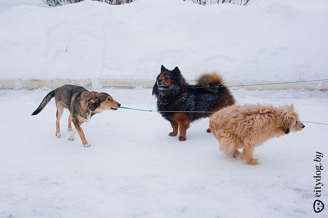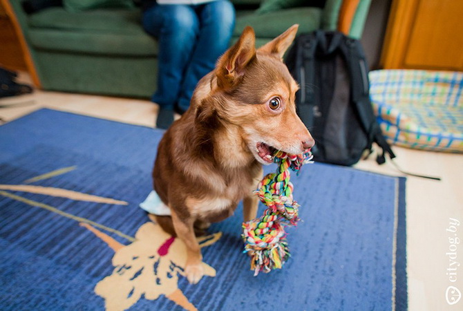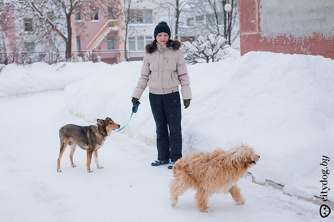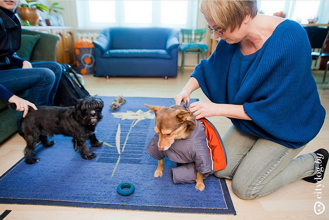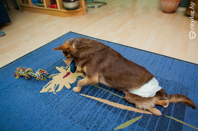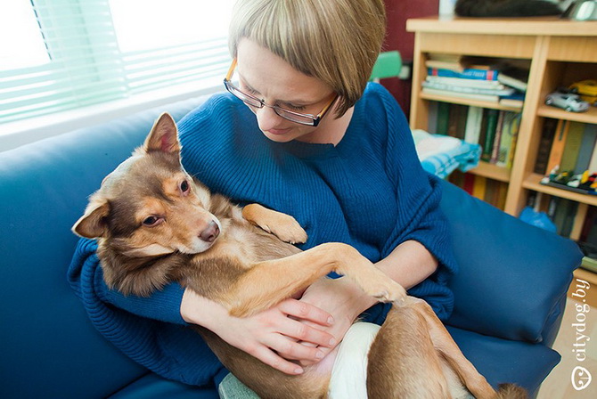 – Около года назад в "Эгиду" позвонили люди: в Лошице, за забором, копошится на метровой веревке под деревом все в крови что-то живое. Спасли Крисмаса – всего изувеченного, со следами крысиных зубов на задних лапках… Предложение ветеринаров было неутешительно: открытые раны конечностей, парапарез, ЧМТ, отмороженный мочевой пузырь. Все предлагали только усыпление. Мы решили отвезти его домой, отмыть, а потом попробовать свозить к еще одному ветеринару, Сергею Сасу, – и тот согласился Крисмаса лечить. Сергей сразу сказал, что пес ходить не сможет, но сможет быть полноценной во всех остальных отношениях собакой. Мы прошли пять курсов лечения, различные массажи, процедуры, думали даже о процедуре введения стволовых клеток, когда были на обследовании в Москве, но отказались – это еще не отработанная практика, да и дорогостоящая. И сейчас Крисмас –совершенно нормальная собака, бегает на двух лапках, играется, грызет игрушки, только на задние лапки стать по-прежнему не может. Поэтому он любит сидеть на руках не как собака, а как ребенок, лапами вверх. Так у него отдыхают передние лапы, на них ведь приходится вся нагрузка. Иногда подлечиваем колени: Крисмас – очень активная собака, много двигается, поэтому натирает их.
