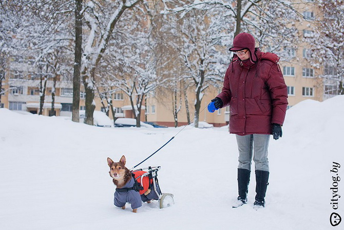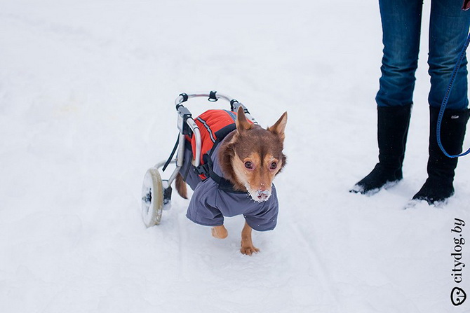 На улице Крисмас носится как сумасшедший. Сейчас, по снегу, конечно, сложно, колеса забиваются снегом, передние лапы страдают от соли, которой посыпают дорожки. Но он все равно любит гулять. Соседи уже все его знают и очень любят. А вот незнакомые люди чаще крутят пальцем у виска, в спину бросают обидные слова. Первое время я еще как-то вступала в перепалки, а потом решила, что каждый человек имеет право на свое мнение, и доказывать кому-то что-либо не имеет смысла. Крисмас отлично себя чувствует: если видит другую собаку – сразу готов лезть в драку, хотя иногда выбирает себе в друзья какую-нибудь мелкую собаку и играет с ней.