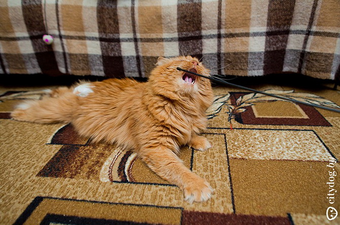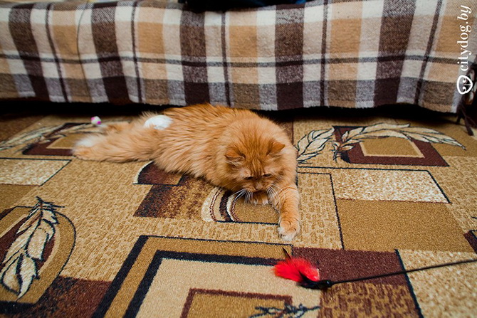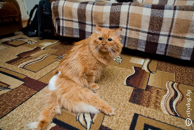 В остальном обычный кот. Нет, не обычный, а самый замечательный! Добродушный человеколюб, благодарный за любое внимание, громко мурлыкающий, встречающий всех гостей на пороге. Немного ленивый, как и многие коты, но когда разыграется – становится котенком: носится за игрушкой, охотится, кувыркается, заигрывает с другими котами. Рыжий обожает других котов и особенно котят, ухаживает, вылизывает, утешает, дикарикам помогает быстрее адаптироваться. На передних сильных лапах спокойно залазит на кресла и диваны, хотя, если рядом люди, будет клянчить, чтобы его подняли. Кроме того, большой плюс Рыжего: он никогда не сбросит цветочный горшок, не прыгнет в открытое окно за бабочкой, не залезет на шторы. Идеальный кот с идеальным характером!